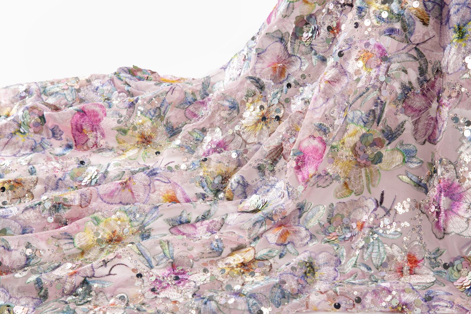 Sequins are securely integrated onto the fabric via high-precision embroidery, creating rich 3D textures and eye-catching shimmer. This ensures design stability and long-term durability.
