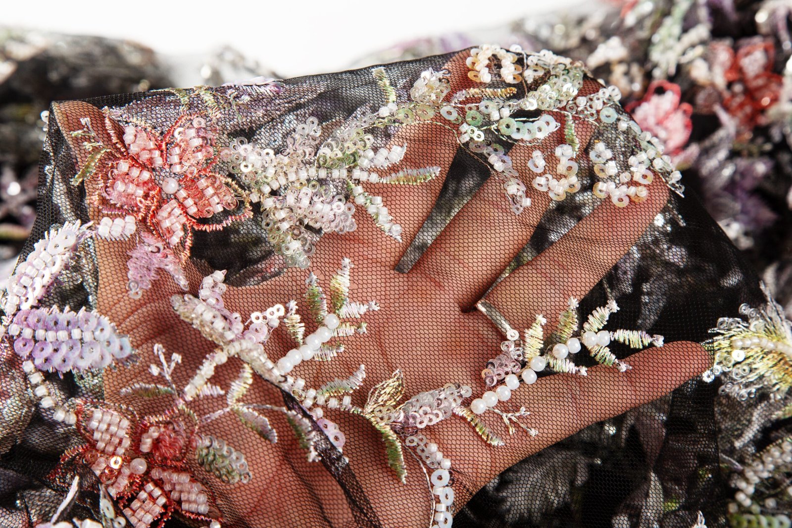 Beaded embroidery lends textiles luxurious dimension through its unique texture and luster. Ideal for enhancing the visual impact of haute couture, bridalwear, and evening gowns.