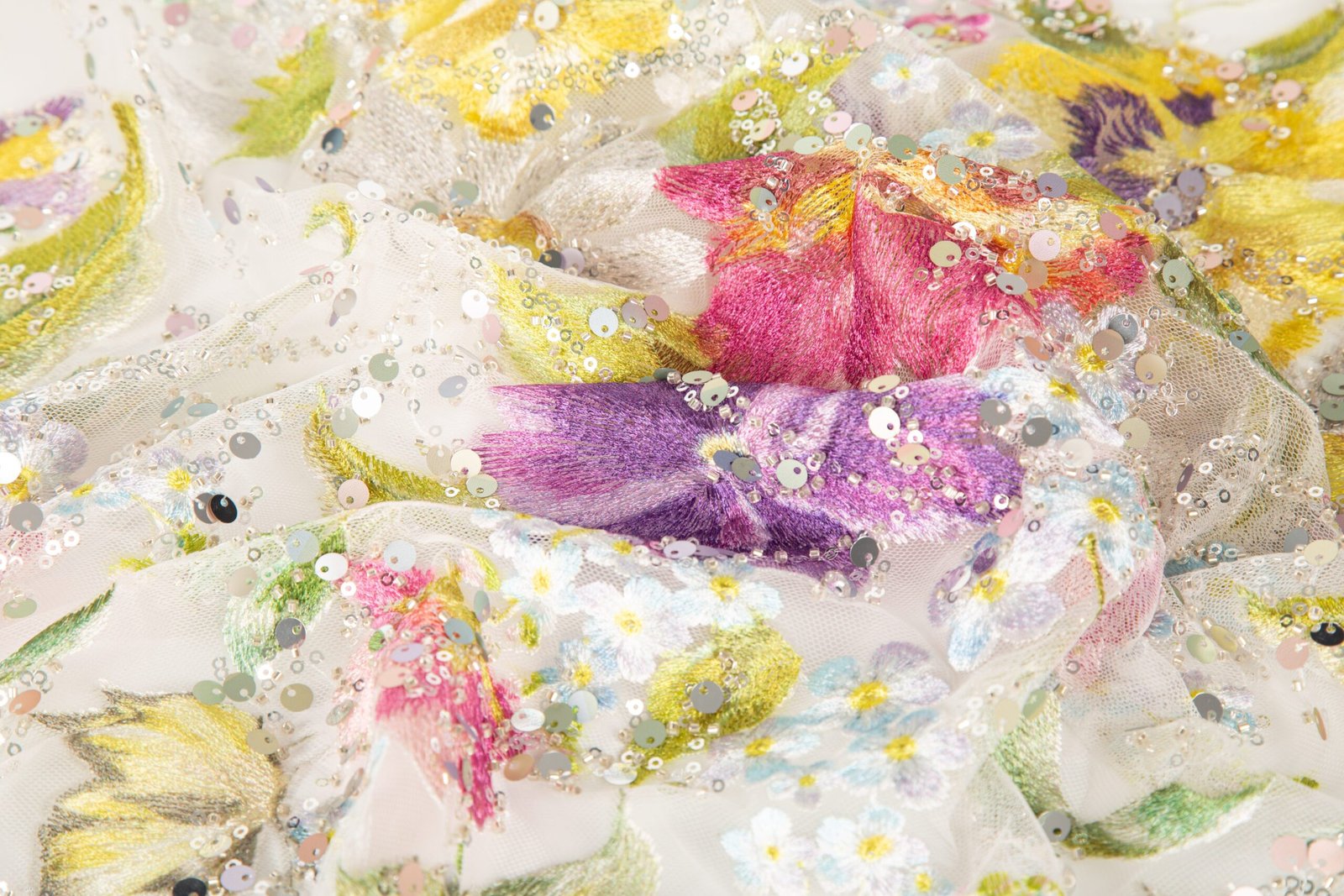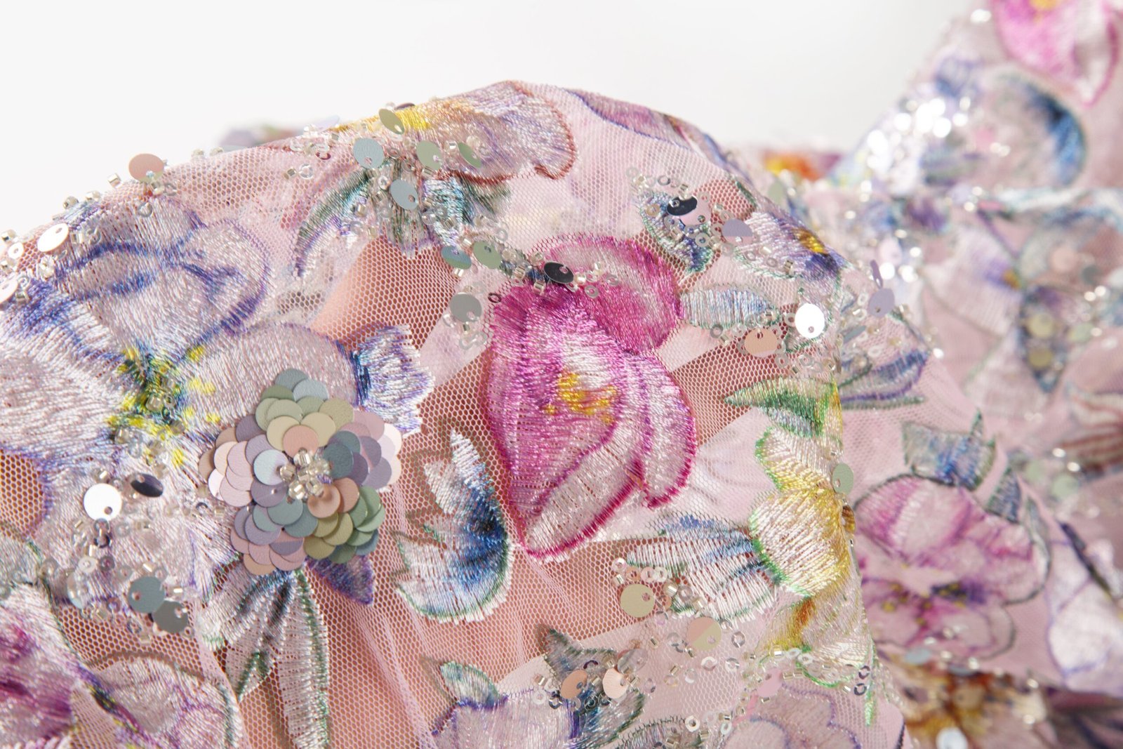Sequins are securely attached through meticulous machine embroidery, ensuring pattern stability and neat arrangement.
